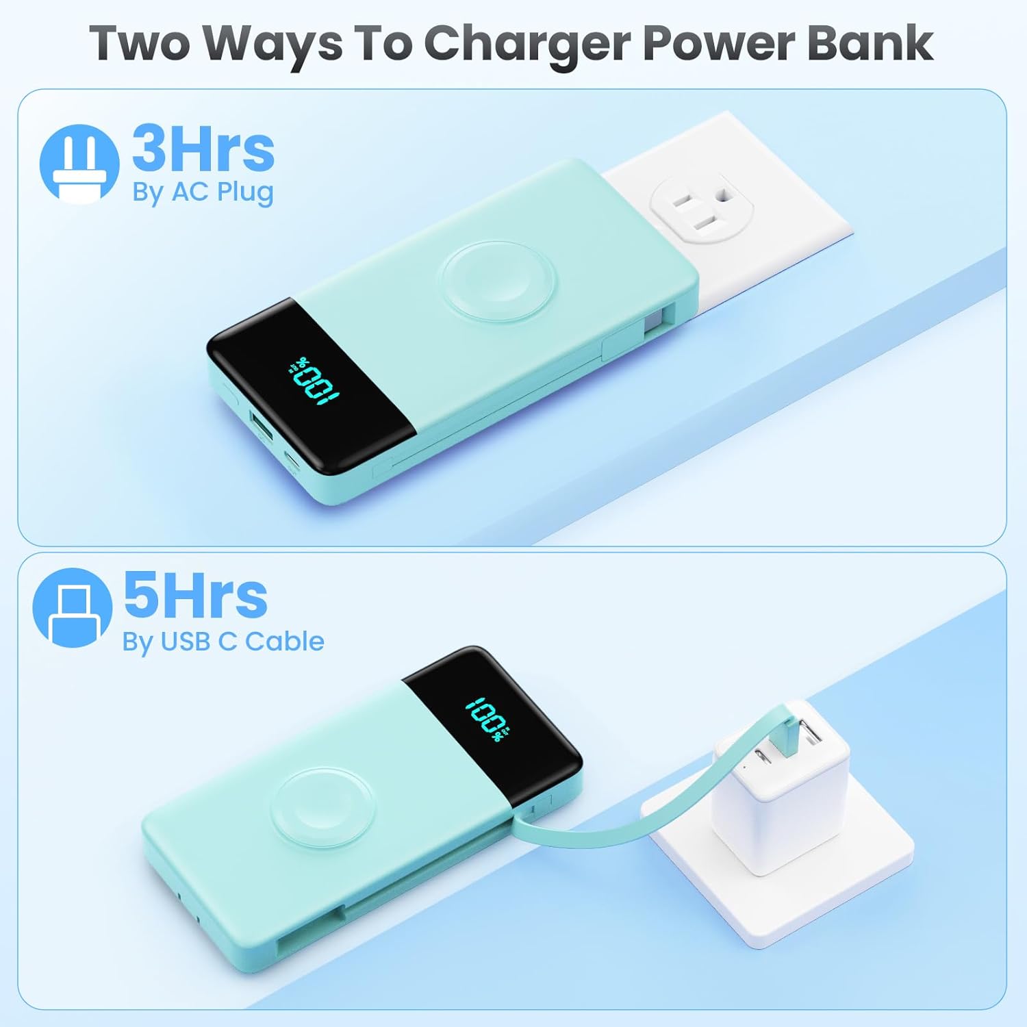 【5 Devices Fast Wireless & Wired Charging】The portable power bank with built-in cords charge both an android or ios phone,fast charging for 5 devices simultaneously. Support iPhone fast charging + max 3W iWatch wireless fast charging + max 20W QC4.0 USB-A output + max 20W PD USB-C output, and max 18W USB-C input.You don’t have to carry any extra cable or adapter to charge your phone and the portable battery charger itself, enjoy your trip.