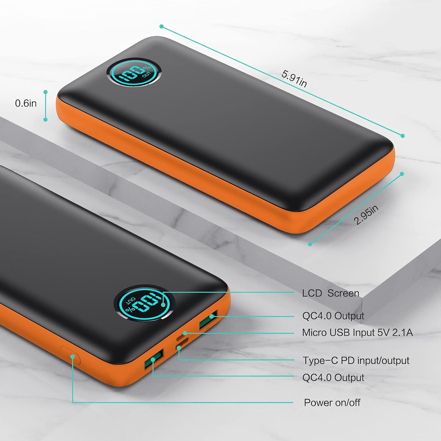 【Universal Compatibility LCD display】 portable charger is universally compatible with all products via USB charging cable, including all iOS and Android smartphones, tablets, other devices and so on. LCD display shows current battery charge ,input and output status, no more guessing whether need to charge it or not.
