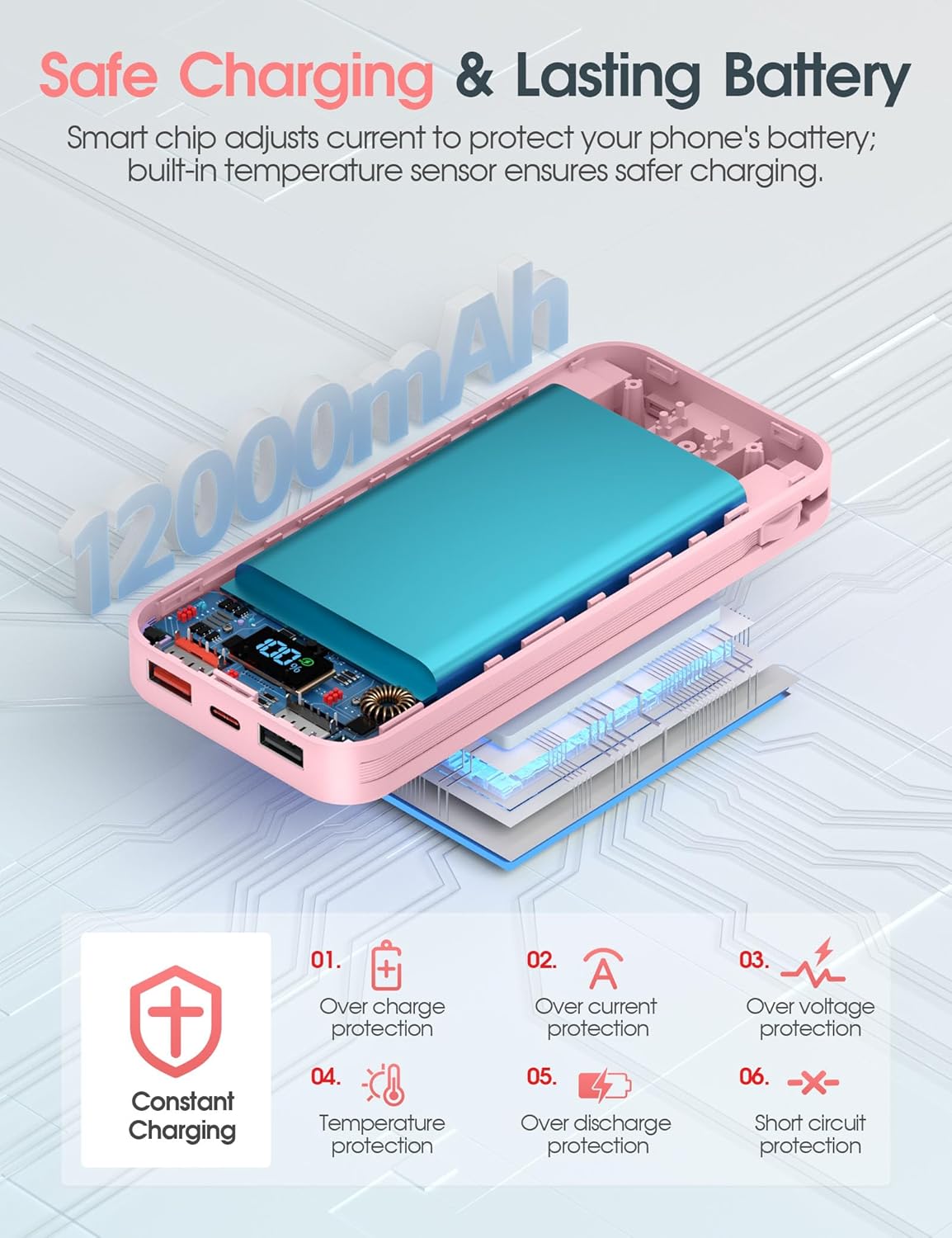 Safe Charging & Long-Lasting Battery: This portable charger features a smart chip that automatically adjusts the current, protecting your phone’s battery while ensuring efficient charging. With a built-in temperature sensor for added safety, it offers reliable power management for all your devices.