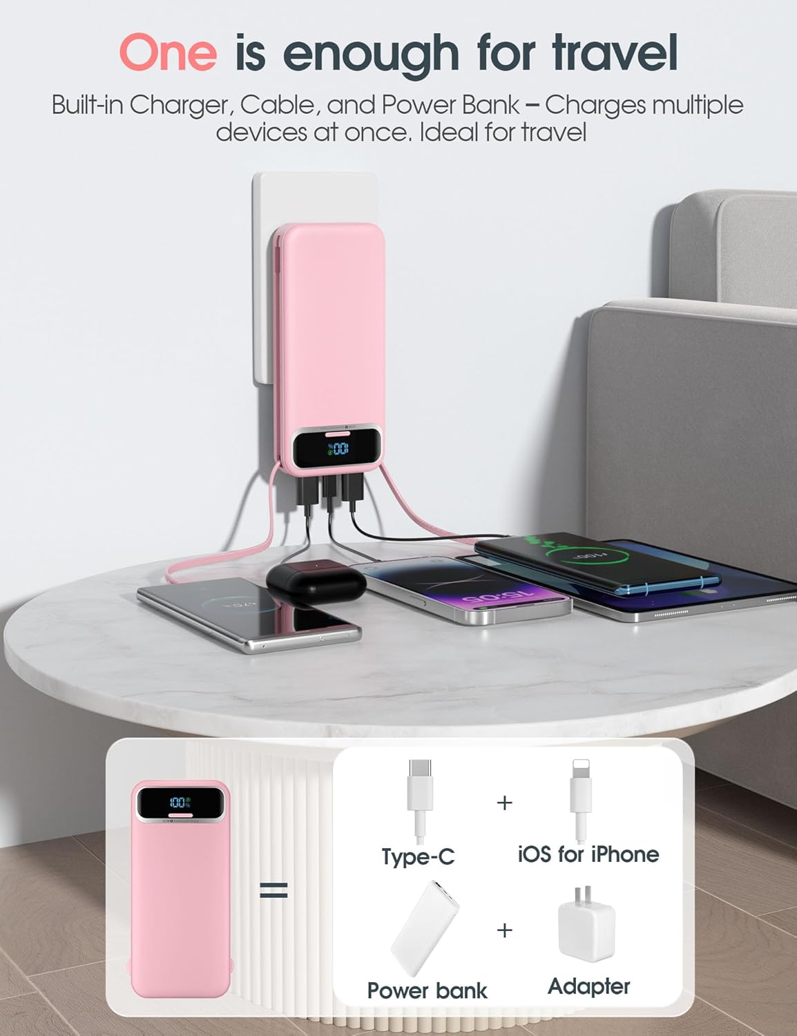 Portable Charger with Built-in Cables:This power bank includes built-in USB-C and iPhone-compatible cables, plus an AC wall plug for easy recharging from any power socket. No extra cords or adapters needed—perfect for travel, camping, or daily use. A great gift for men and women on the go.