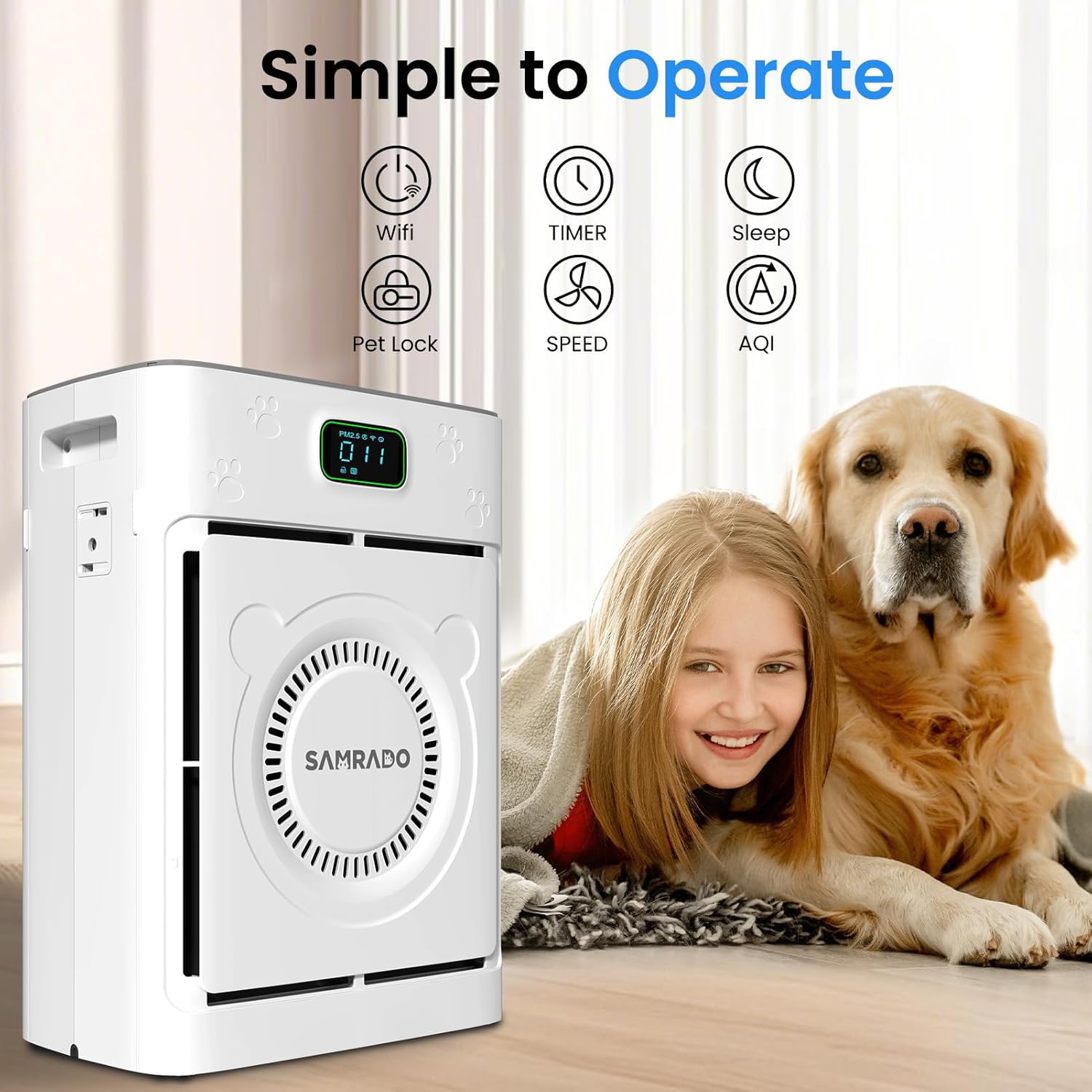 USER-FRIENDLY DESIGNU: With the free smart APP set precise start and end times for Samrado, choosing fan speed and mode like Pet Mode, Auto Mode or Sleep Mode for different periods. and the sleep mode is very quiet with noise as low as 20dB. At night you can control it with your cell phone and turn the lights off so that there are no lights in the room disturbing your sleep all night long. Additionally, The HEPA air purifier has a considerate Child Lock design and a mode for adjusting multiple fan speeds.