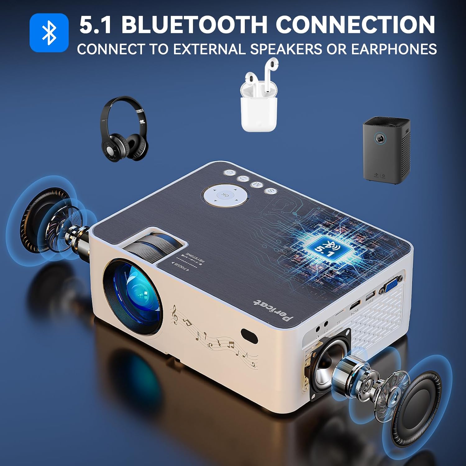 [2.4G+5G Wifi & 5.1 Bluetooth Connection] Compared with other basic 5G WIFI projectors, our WIFI Bluetooth projector support both wireless and wired projection for IOS and Android systems. 5G WIFI connection ensure you smoother and lag-free online video streaming and gaming experience. The Built-in 4x3W HiFi Stereo Speakers give you surrounding sound quality. You can also plug in external speakers via the 3.5mm Aux port for better sound with the upgraded 5.1 Bluetooth connection.