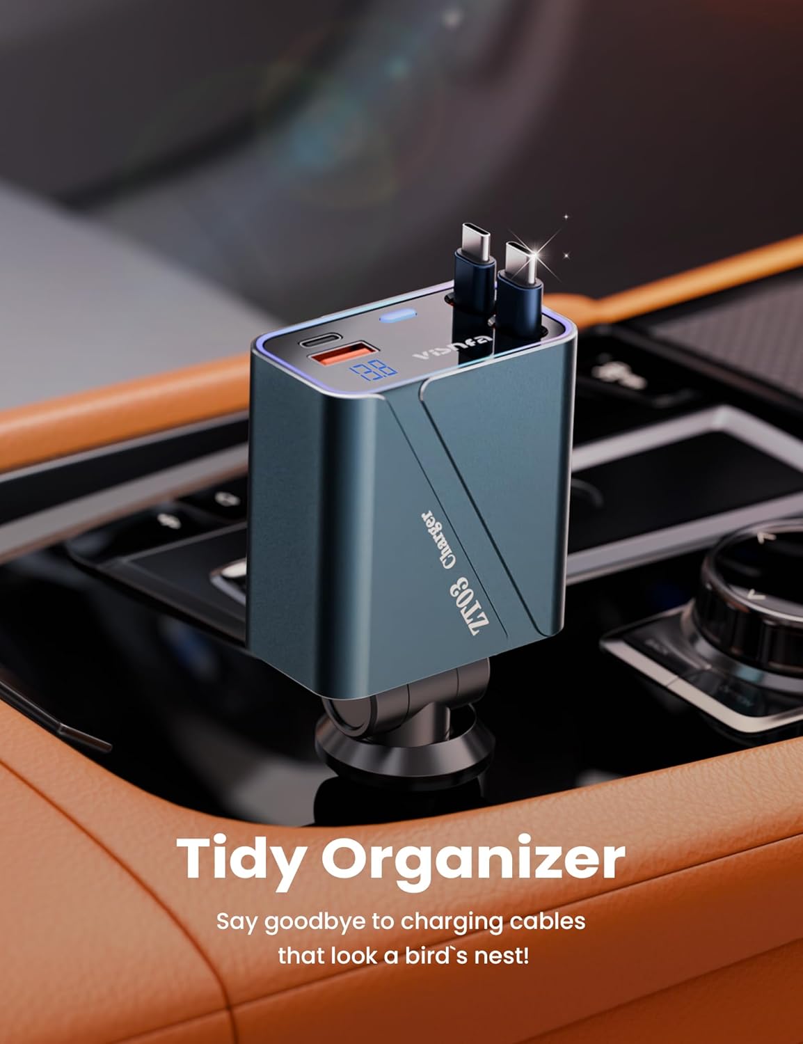 180W Max 4 Port Car Charger: visnfa Retractable Car Charger 4 in 1, this powerful USB C car charger features two 66W Max Type C cables, a 12W Max USB C port, and a 36W Max USB a port, allowing for efficient and fast charging of up to four devices simultaneously. The 4 in 1 Retractable car charger is perfect for users looking for iPhone 16 car charger port and other USB-C compatible devices