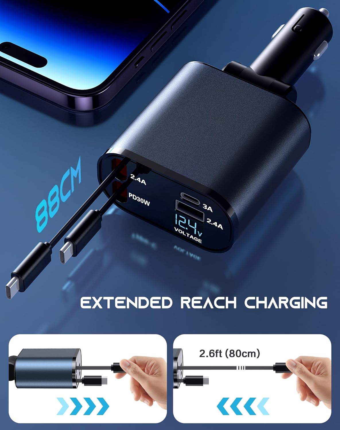 ZERO CLUTTER & FLEXIBLE 180° ADJUSTABLE – The car cigarette lighter charger is equipped with innovative built-in retractable cords, extending up to 80cm (2.6ft) to reach any seat with a simple pull, and neatly retracts back after use. Plus, the head of this car charger adapter can be adjusted up to 180° left or right for added flexibility. No more tangled cables and cluttered dashboards!