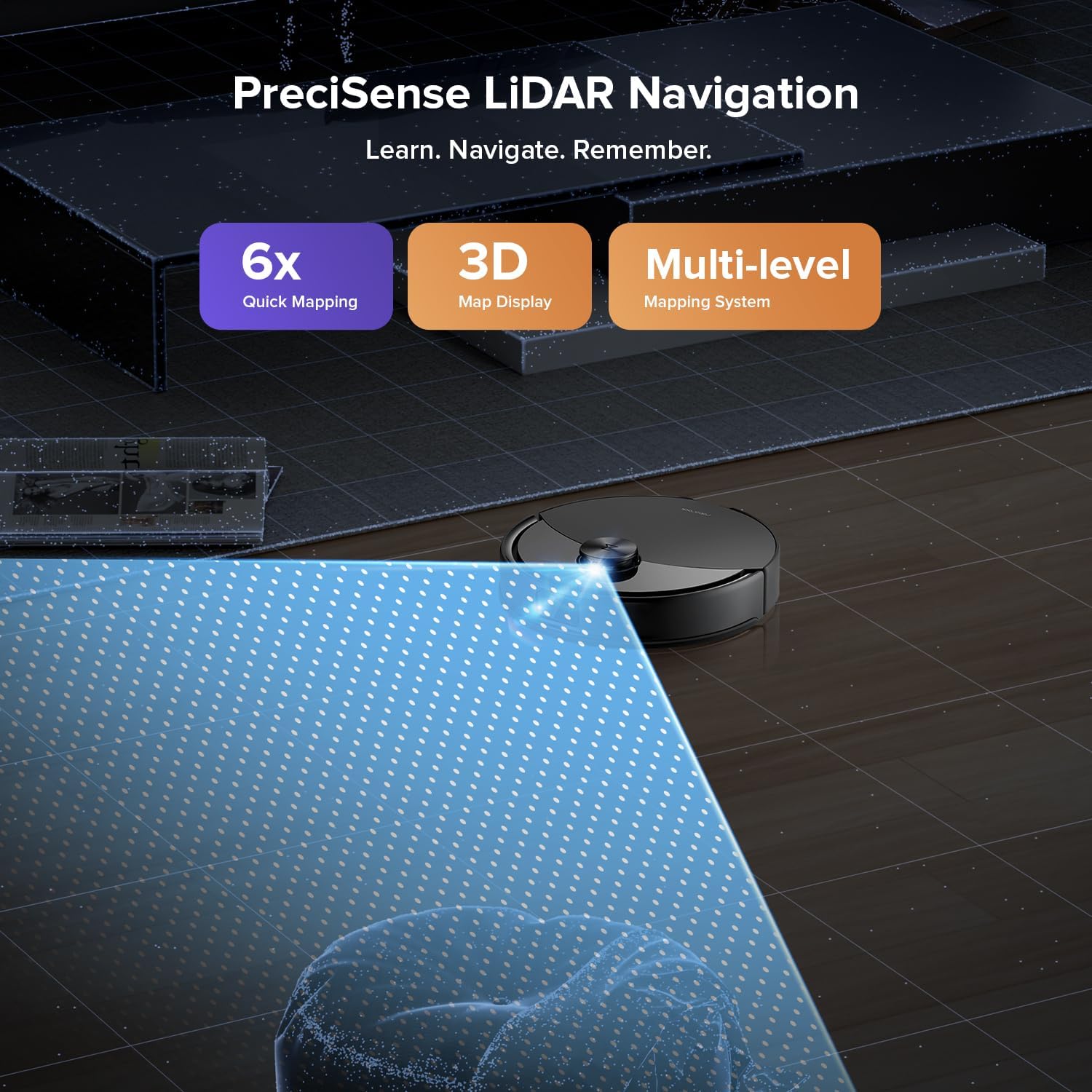 PreciSense LiDAR Navigation – The LiDAR-based system scans 360° to create highly detailed 3D maps and supports multi-level mapping for efficient navigation across different floors. Enjoy precise route planning for quick, accurate, and thorough cleaning in every corner of your home.