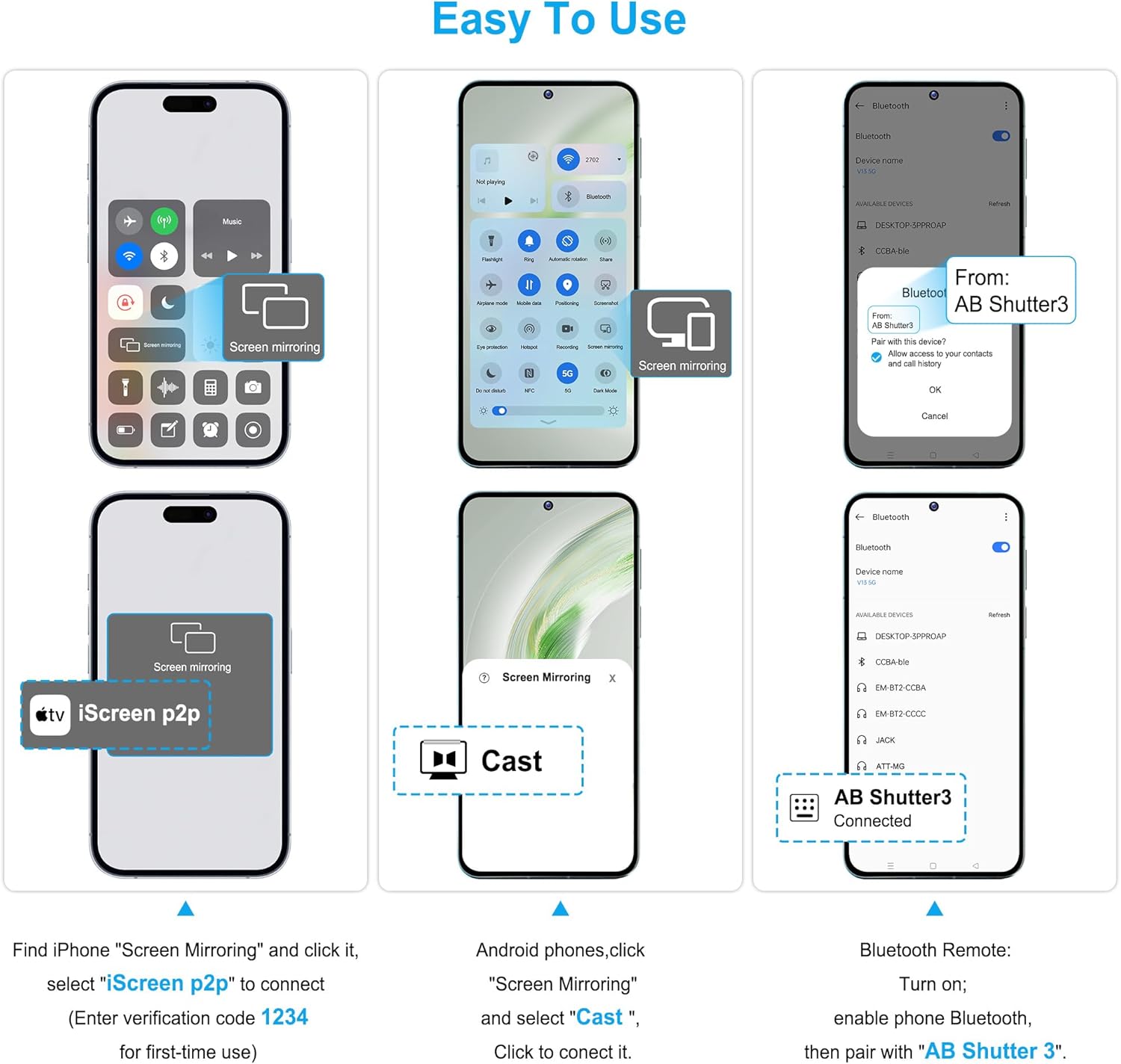 Wireless Selfie Monitor Screen: Includes Bluetooth remote (33ft range) for smooth screen mirroring for iPhone. Experience freedom with this wireless selfie monitor screen – capture well-composed shots remotely, eliminating awkward arm stretches
