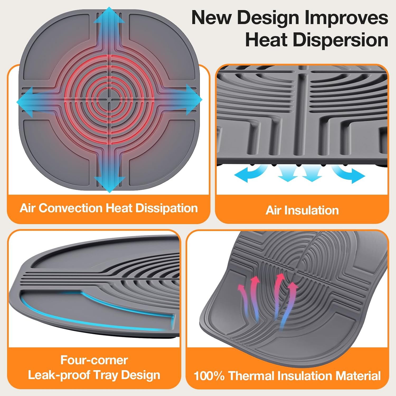 2.MULTIFUNCTIONAL DESIGN: The four corner grooves of the tripod can be used as a tray to collect any oil or liquid that may be spilled while the air fryer is cooling. The non-slip design ensures that the silicone mat stays firmly in place on the countertop, preventing it from sliding or falling off.