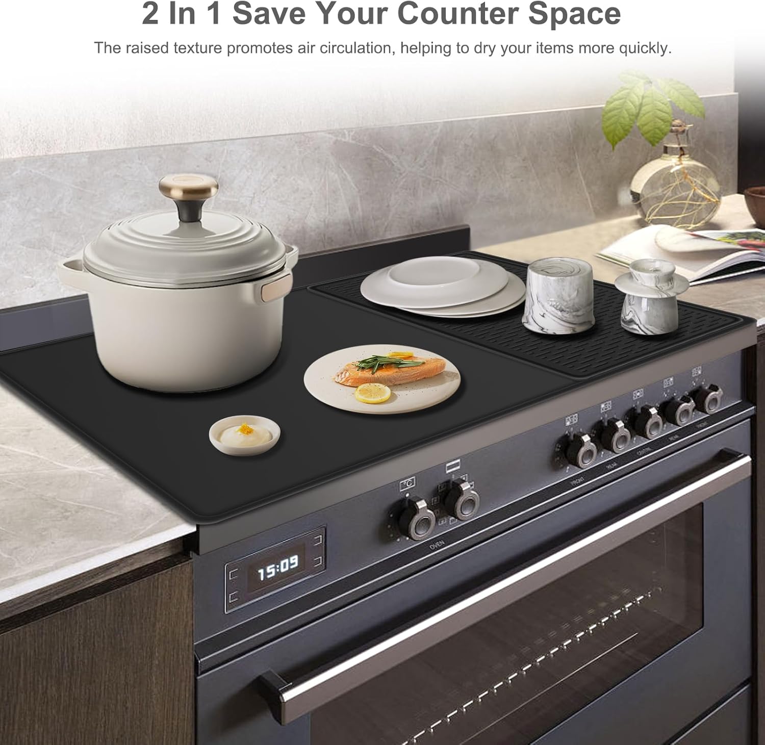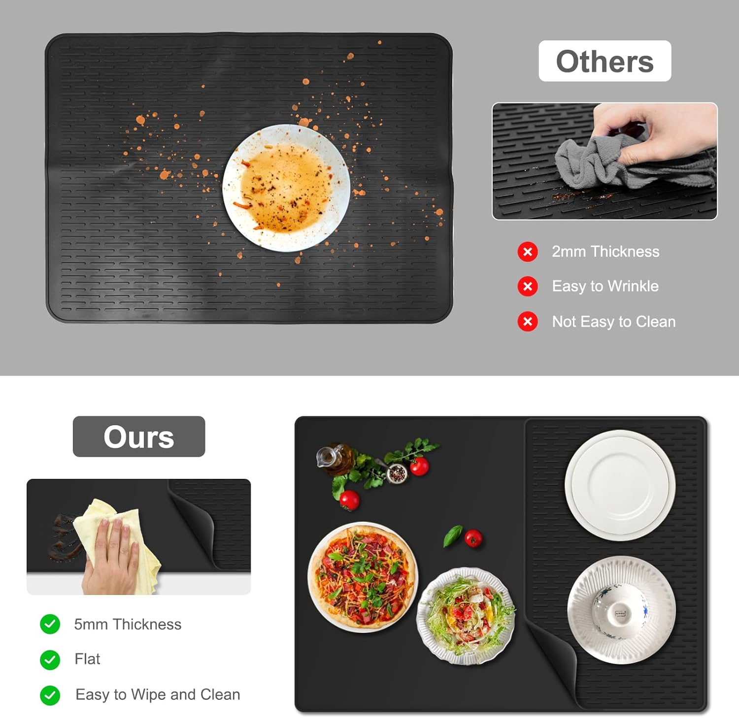 Doubles as a Drying Mat – Raised ridges can enhance air circulation for improved ventilation while capturing drips from dishes, glasses, fruits, and veggies. Its high edges and waterproof bottom prevent spills, keeping countertops dry and pristine, making it the perfect kitchen drying mat