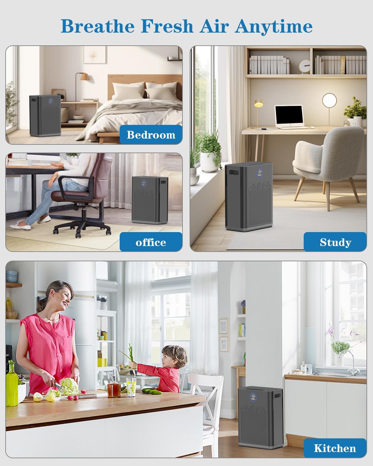 【H14 HEPA FILTER】Our air purifiers for home feature two upgraded H14 HEPA filters,capturing 99.997% of particles as small as 0.1 micron, more efficient and powerful than H13, combined with pre-filter, H14 HEPA filter, activated carbon filter and net filter to achieve the highest performance, effectively remove dust, smoke, pollen, hair and odor ect. With our Hepa air purifier, you can breathe easier and enjoy a fresher, cleaner air environment.