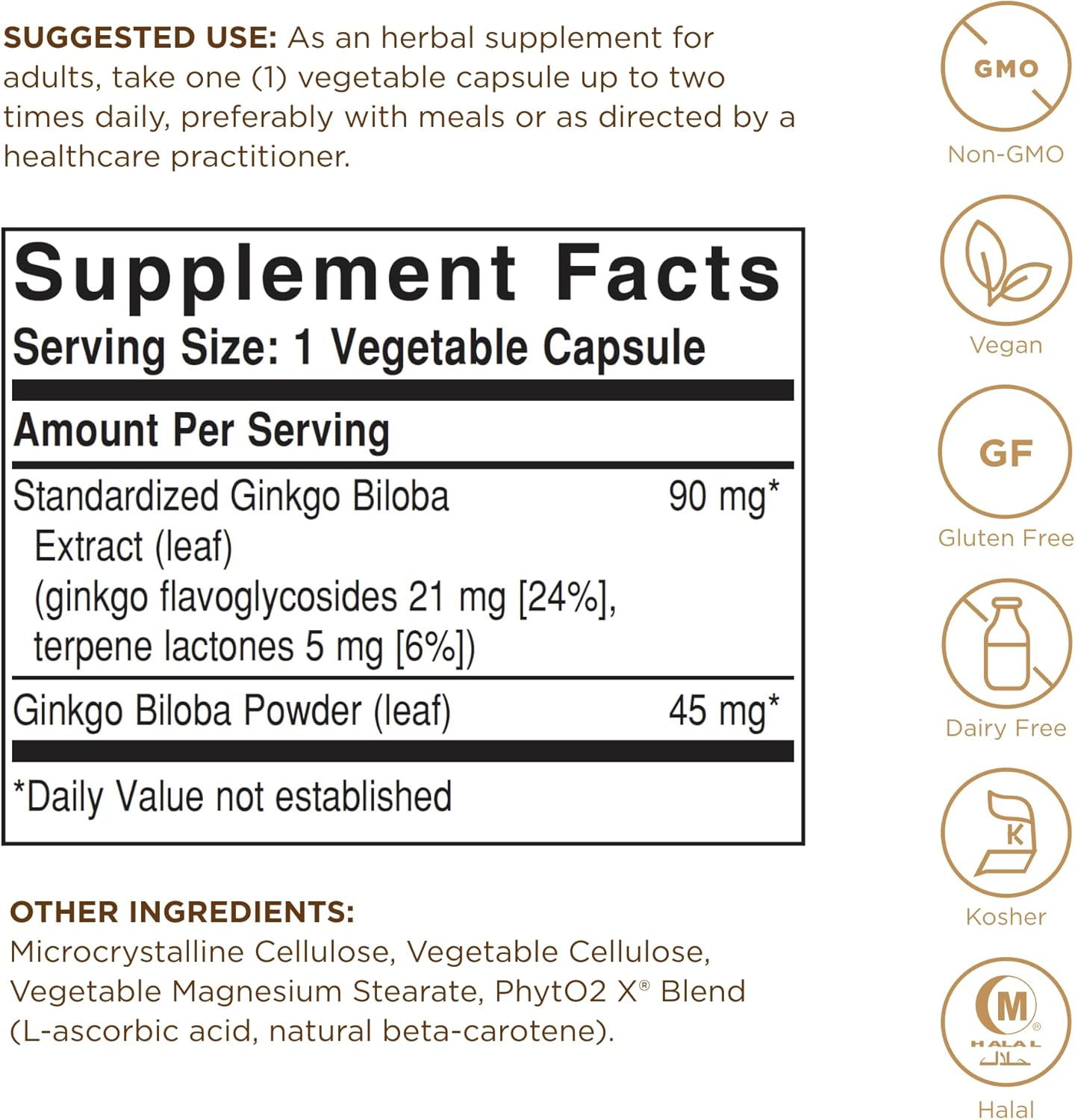 Gluten, Wheat & Dairy Free; Solgar Ginkgo Biloba Leaf Extract is non-GMO, vegan, kosher, halal, and free of: gluten, wheat, yeast, sugar, salt, artificial flavors, artificial sweeteners, and artificial colors.