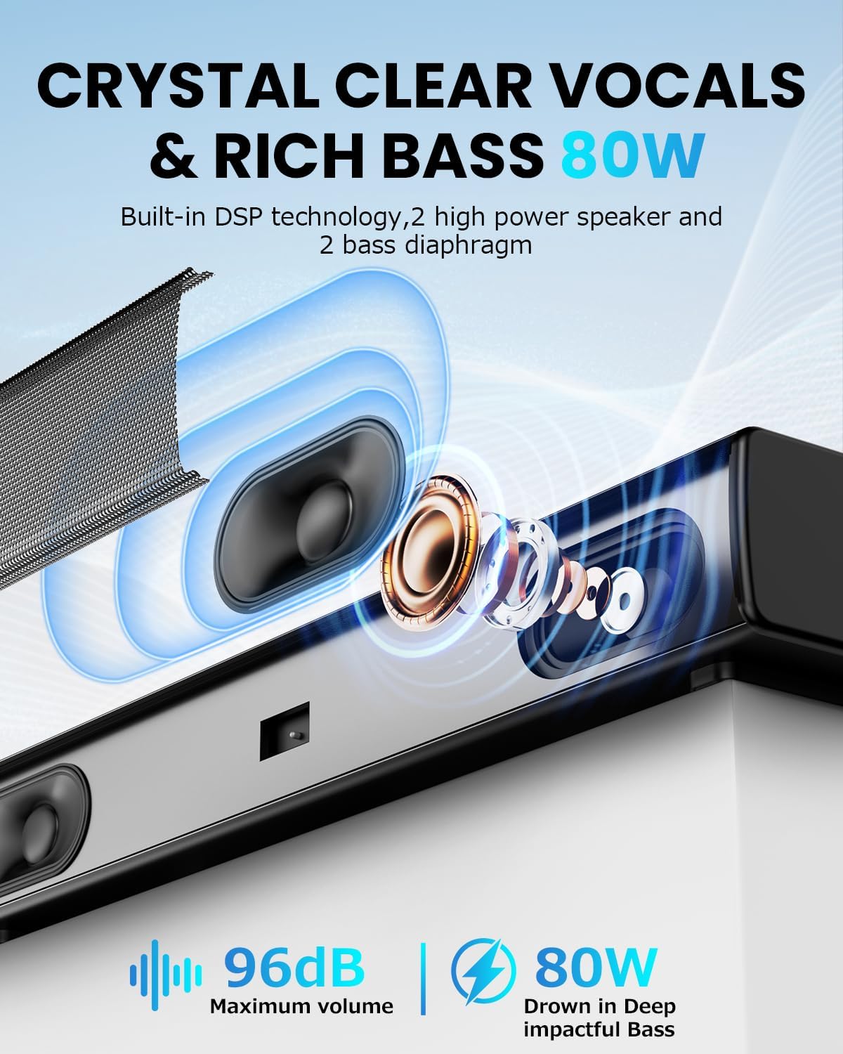 đľăUnmatched Audio Surround Soundă OFFSIR Sound Bar for TV Features powerful 80W output, 2 high-power speakers, and 2 bass reflex ports, which deliver crisp treble, punchy bass, and clear vocals simultaneously. Enjoy a surround sound effect that envelops you in audio from all directions.