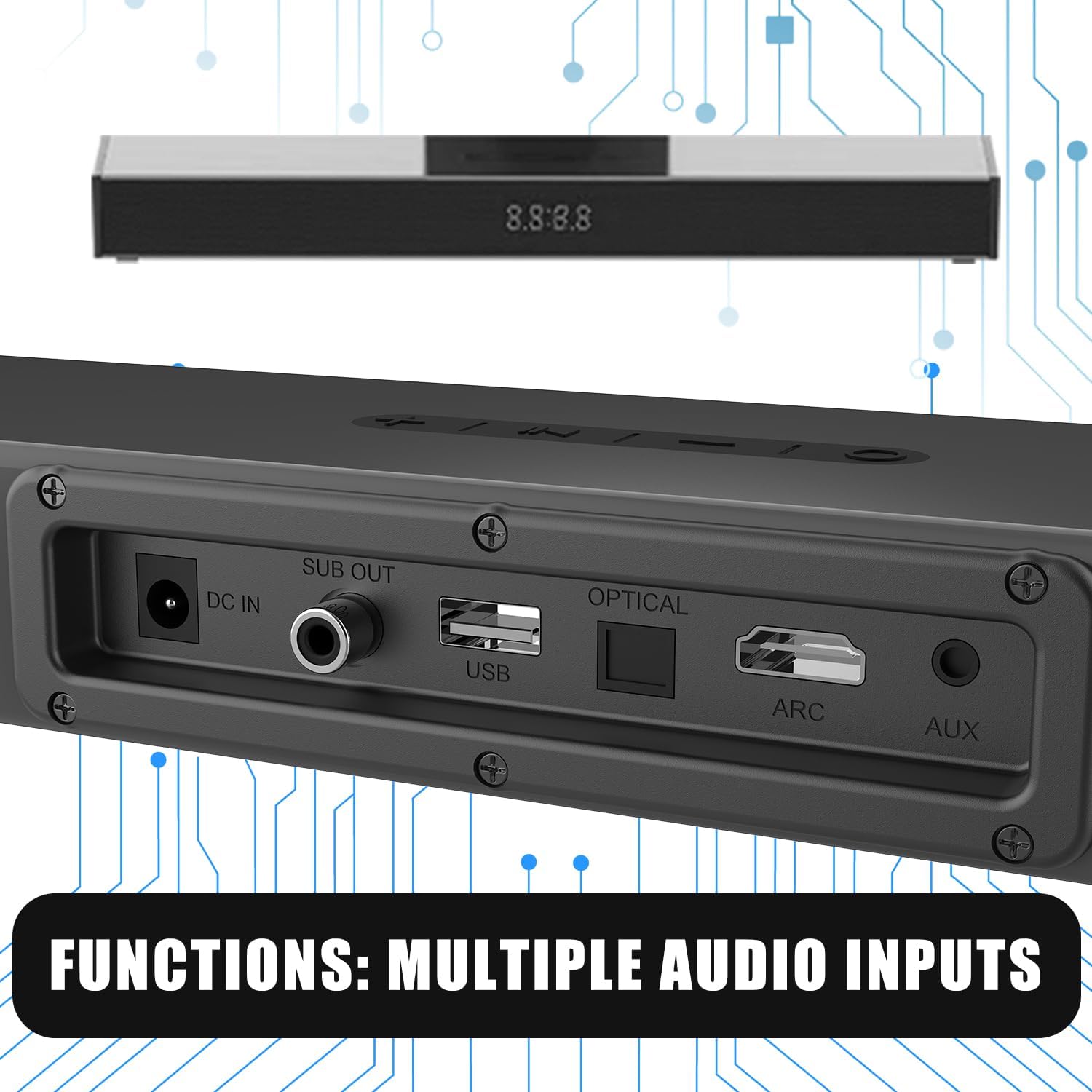 Surround system sound bar for Smart TV: supports Bluetooth, USB stick, AUX, fiber, HD MI-eARC output and plays music. It is compatible with all kinds of devices that have this connection,With a built-in 3D superior DSP technology, this sound bar delivers powerful, crystal-clear audio, and you can easily switch between 10 different EQ modes, immersing you in the most incredible home theater sound environment.