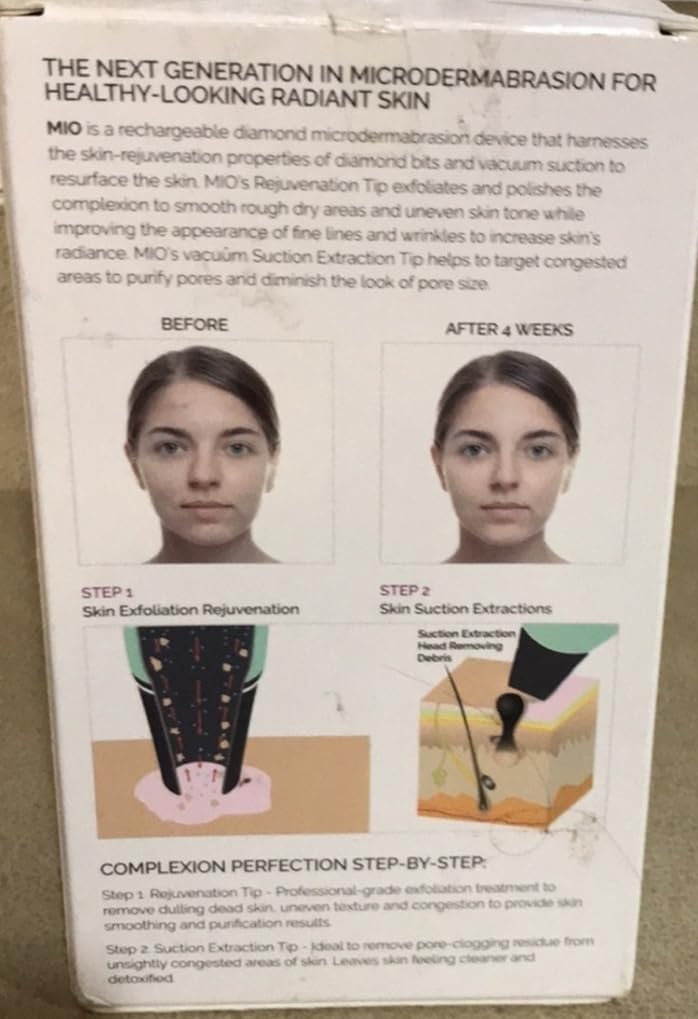 Transform your skincare routine with this professional-grade microdermabrasion and pore extraction system. The MIO device features patented diamond technology designed to improve multiple skin concerns including dry patches, fine lines, wrinkles, pore size, age spots, firmness, blackheads/whiteheads, and acne scarring. This mint-colored handheld device offers salon-quality treatment in the comfort of your home. The sleek design includes an easy-to-read power indicator and intuitive controls for precise application. Experience noticeably fresher, more radiant skin after just one use. The system effectively resurfaces skin while extracting impurities, helping to reveal a smoother, more refined complexion. Perfect for those seeking professional-level skincare results without frequent spa visits.