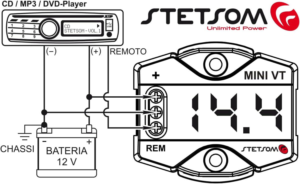 STETSOM MINI VT Digital Voltmeter. An ultra compact voltmeter for installation anywhere. Accurate voltage follow-up. Perfect for keeping monitoring your reliable sound system with measuring range from 7 to 30Vdc. Features Remote Drive for added security and convenience for your sound system and Blue LEDs. Stetsom Tip: Due to its economical cost, you can utilize a MINI VT STETSOM on each battery of your High Voltage system for your individual monitoring.
