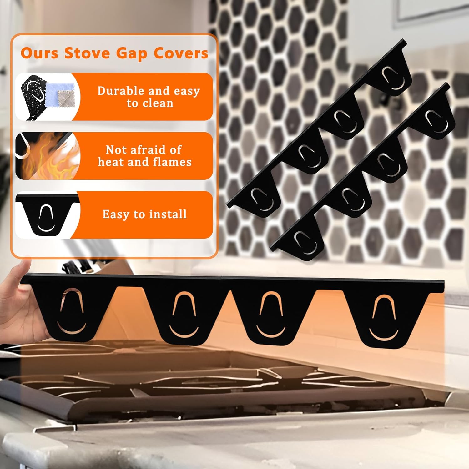Stove gap fillers and countertop gap filler withstands temperatures up to 500°F (260°C). Kitchen stove gap cover for protects against accidental spills and stove guards for gas range without warping or discoloration.