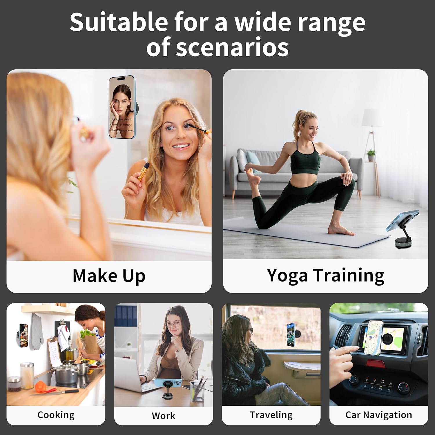 【Multi – Scene Application】This magnetic suction phone mount combines vacuum suction and magnetic suction. The suction cup can be firmly attached to any smooth surface. It is not only used for Cars, but also can be used for Traveling, Gym, Kitchen Cooking, Makeup, Shower Room and other scenes, freeing your hands. It is also the best choice for content creators on social media platforms (such as TikTok, YouTube, and Instagram, etc.)
