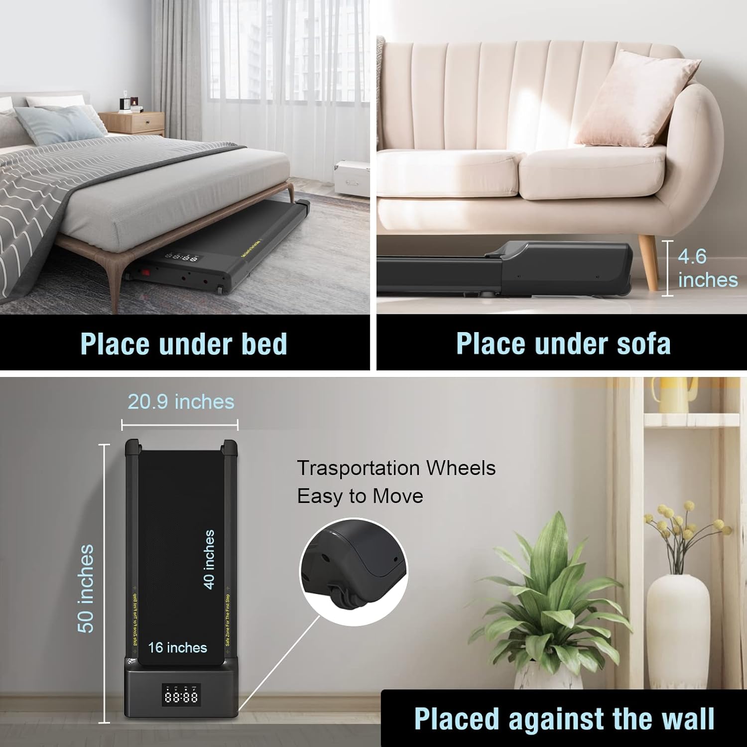 【Space saving & Easy to move】Under the desk treadmill machine is only 44 lbs and easy to move with wheels, besides it is slim in thickness and can be easily stored under the sofa or bed for saving a lot of space.