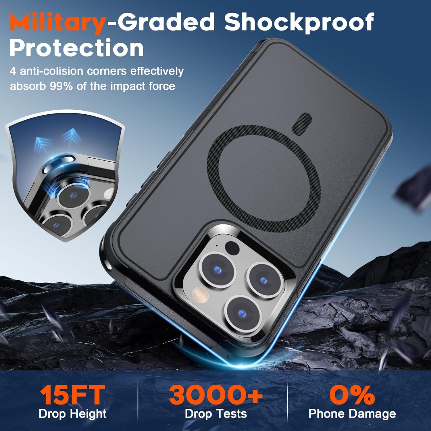 SUPFINE Magnetic for iPhone 15 Pro Case, [Compatible with MagSafe] [15FT Military Grade Drop Protection] [2pcs Tempered Glass Screen+Camera Lens Protector] Heavy Duty Shockproof Phone Case, Black