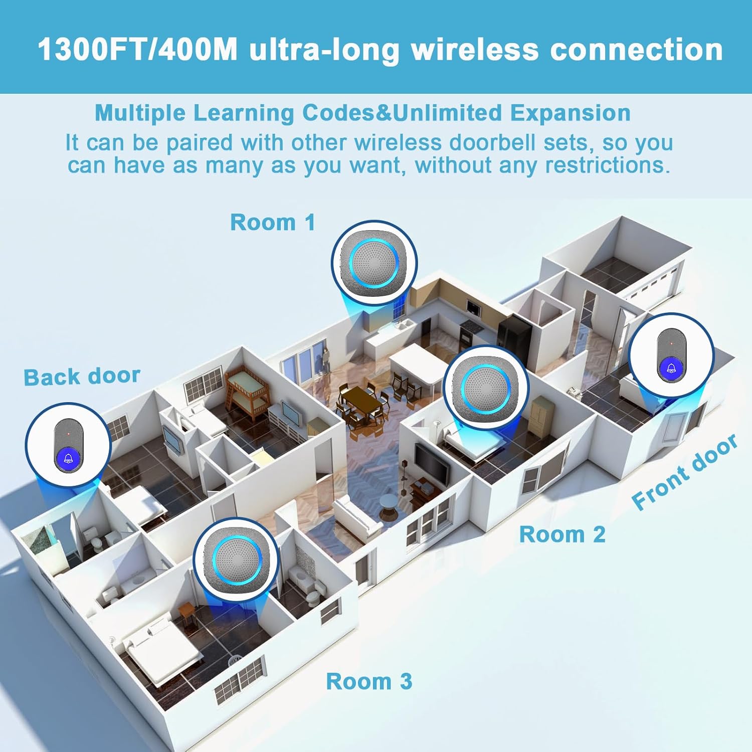 【Extendable Door Bell System】With up to 64,000 learning codes,you can add multiple receivers and transmitters of the same model to expand your door bell system.The doorbell is designed to aesthetically fit all types of homes and is also suitable for offices, stores, business and many more.