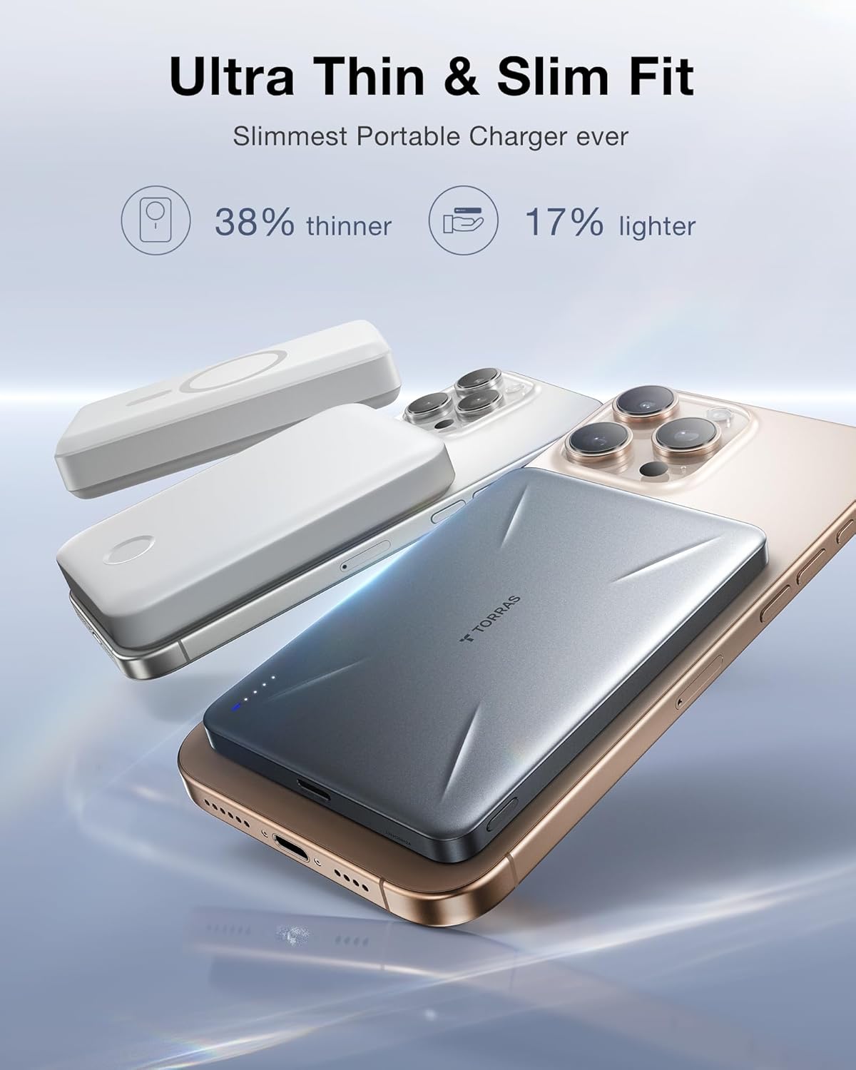 Thinner Than Ever: Torras redefining portability, this portable charger is 38% thinner and 17% lighter than other power bank of 5000mAh. Just 0.3in thin, weighing 0.26 lbs(1 Torras MagSafe Portable Charger≈ 1/2 iPhone 16 Pro Max). Easily snap to your phone and slip into your pack, purse, or pocket on-the-go.