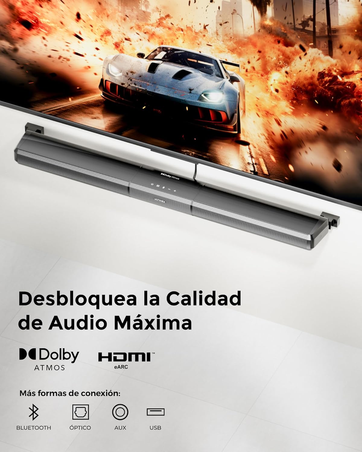 Dolby Atmos Home Theater: This surround sound bar for TV creates immersive 3D audio with Dolby Atmos support. Built-in DSP converts stereo to 5.1 channels, while HDMI-eARC (37Mbps) ensures lossless audio transmission. Perfect for home theaters up to 380 ft², delivering cinema-quality sound.