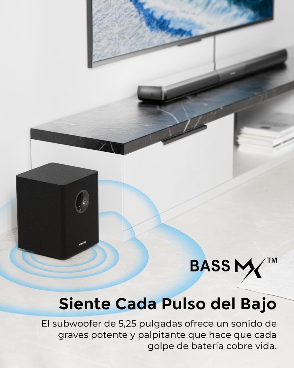 5.1 Surround Sound System: The sound bar for smart tv featuring 5 full-range drivers and a 5.25″ wired subwoofer with BassMX technology, this surround sound system sound bar for TV produces powerful, balanced audio. Aerospace-grade components ensure crystal-clear dialogue and deep bass (Note: Optimized for 200-380 ft² spaces).