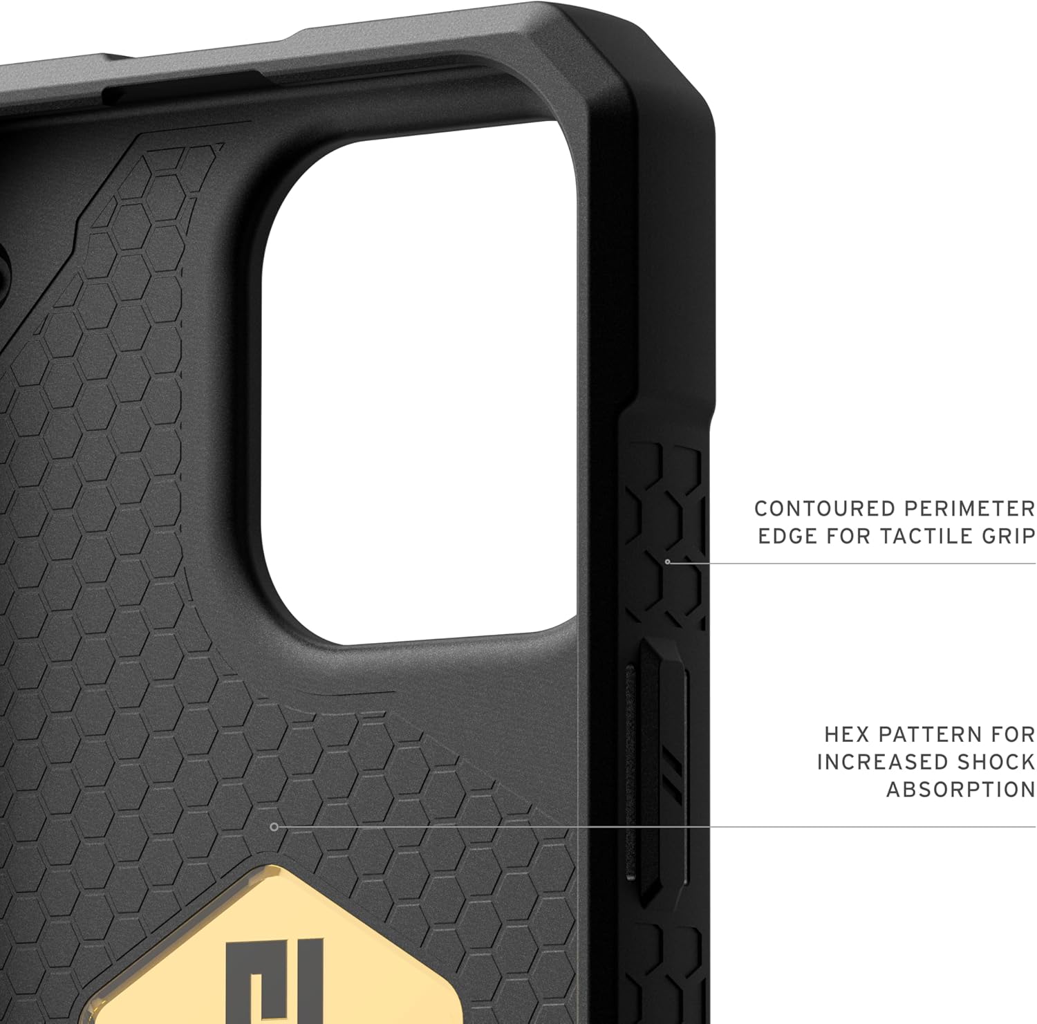 Military Grad Drop Proof Tested: PC + TPU Chassis (TPU frame, PC backplate). Sculpted corners for reinforced drop protection and inner hex pattern for increased shock absorption. Signature armor frame with a PU vegan leather inlay. 25 ft. Drop Protection (7.6 meters). Meets 5X Military drop-test standards (MIL STD 810G 516.6).