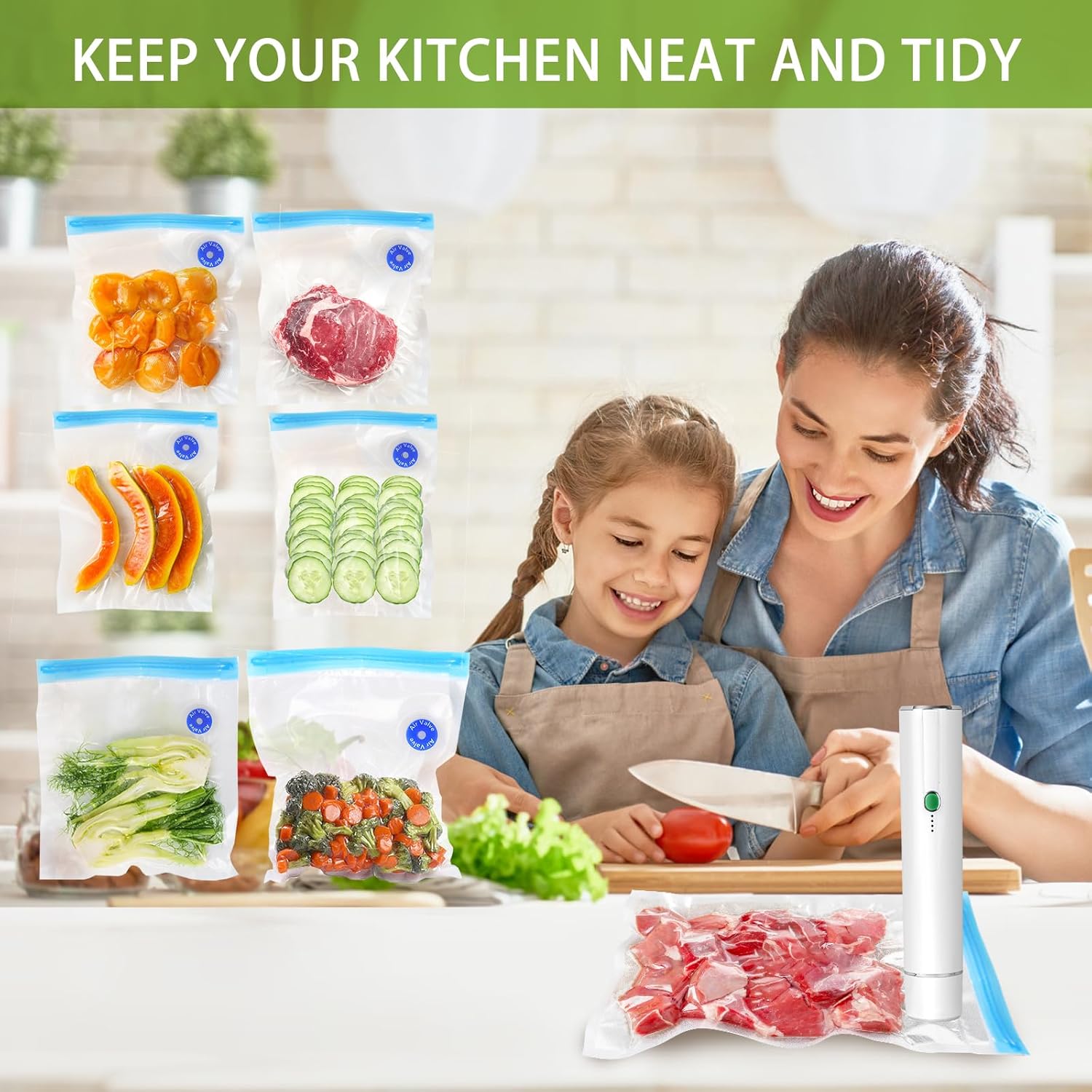 Fresh & Saving Space: Vacuum packing various ingredients such as fruits, raw meat, leftovers, etc. not only saves space in the refrigerator, but also ensures the freshness of the ingredients, and prevents the stringing of flavors between the ingredients.