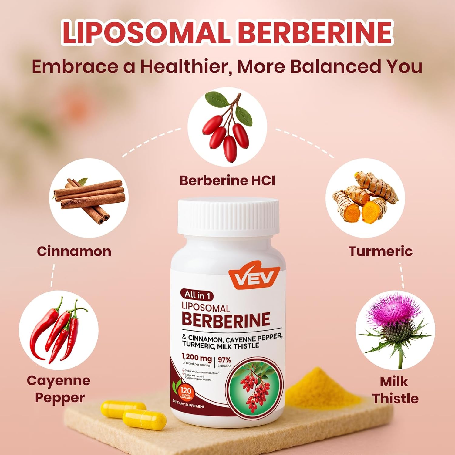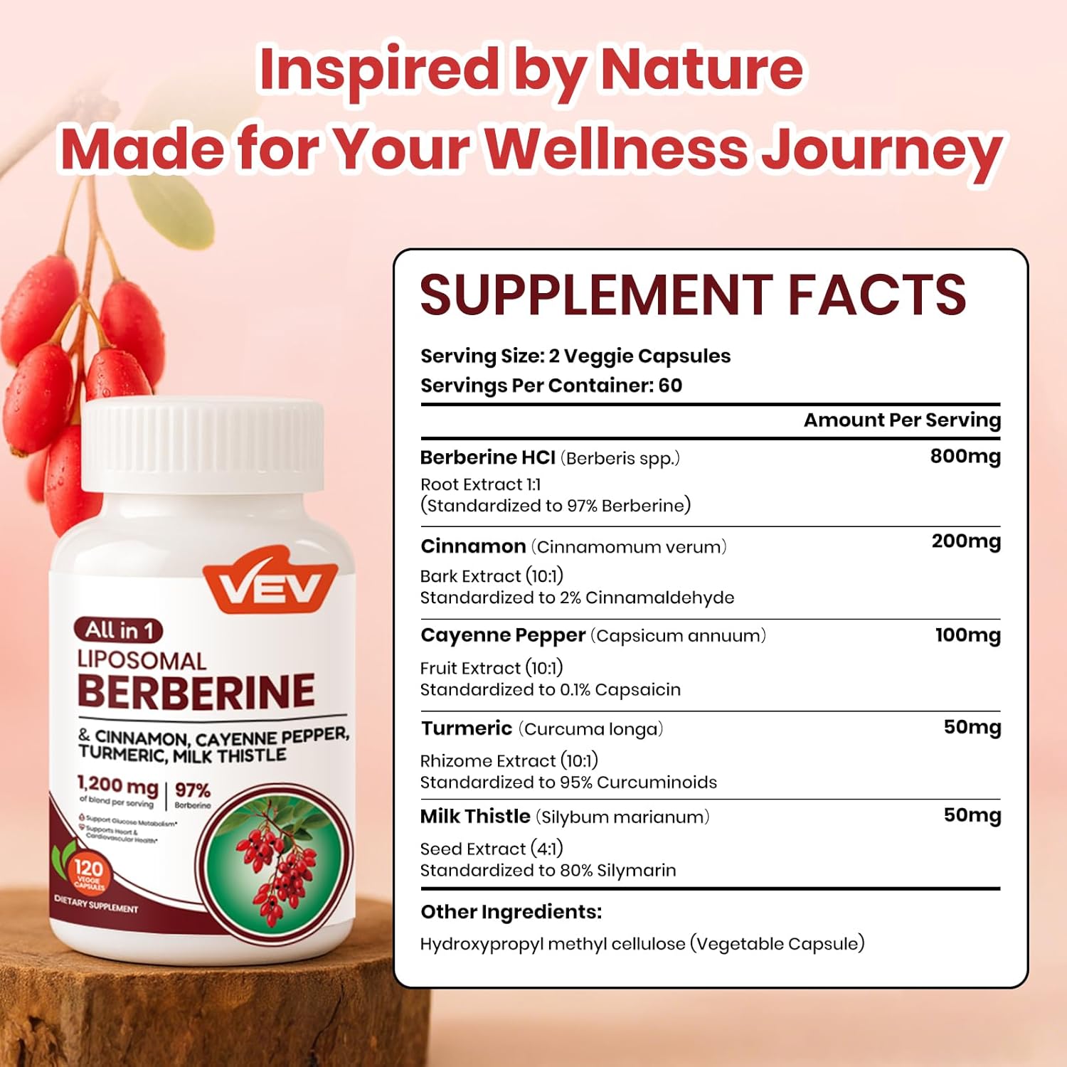 VEV Berberine Supplement with Ceylon Cinnamon, Cayenne Pepper, Turmeric, Milk Thistle, Vegan & Non-GMO – 120 Capsules