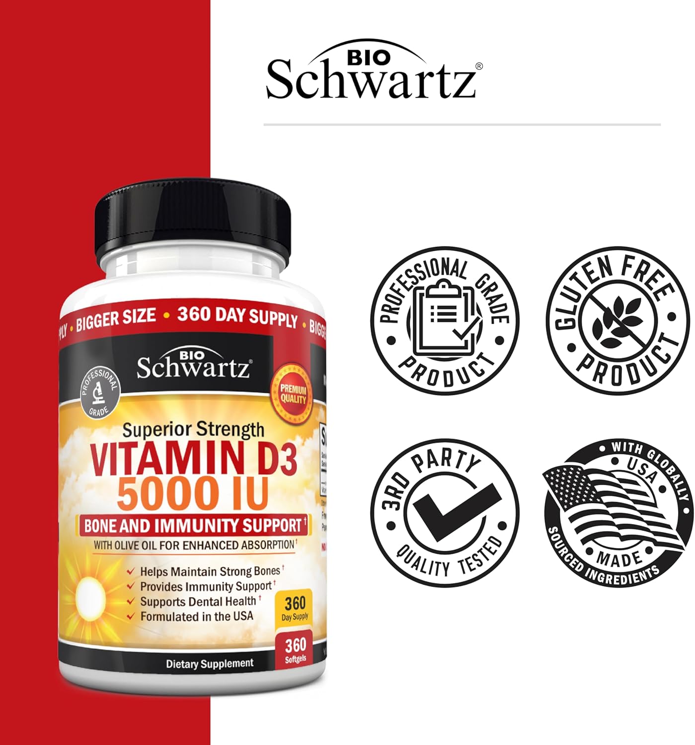 Enhanced absorption & bioavailability: BioSchwartz superior strength vitamin D3 5000 IU features organic olive oil to help enhance absorption and maximum efficacy to deliver essential whole body benefits including immune, heart and bone health support