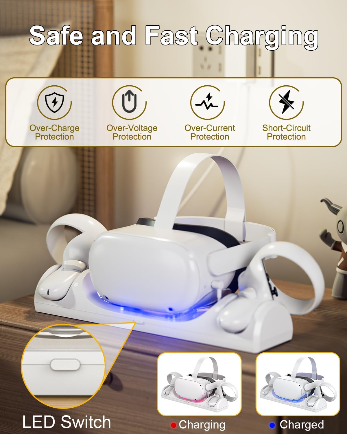 【Magnetic Charging and LED Indicator】With magnetic charging, there is no need to plug and unplug frequently. Just place the Quest 2 in the VR charging dock, and the LED light shows whether it is charging (red) or fully charged (blue). The one-touch switch lets you turn off the light at night for a peaceful rest.