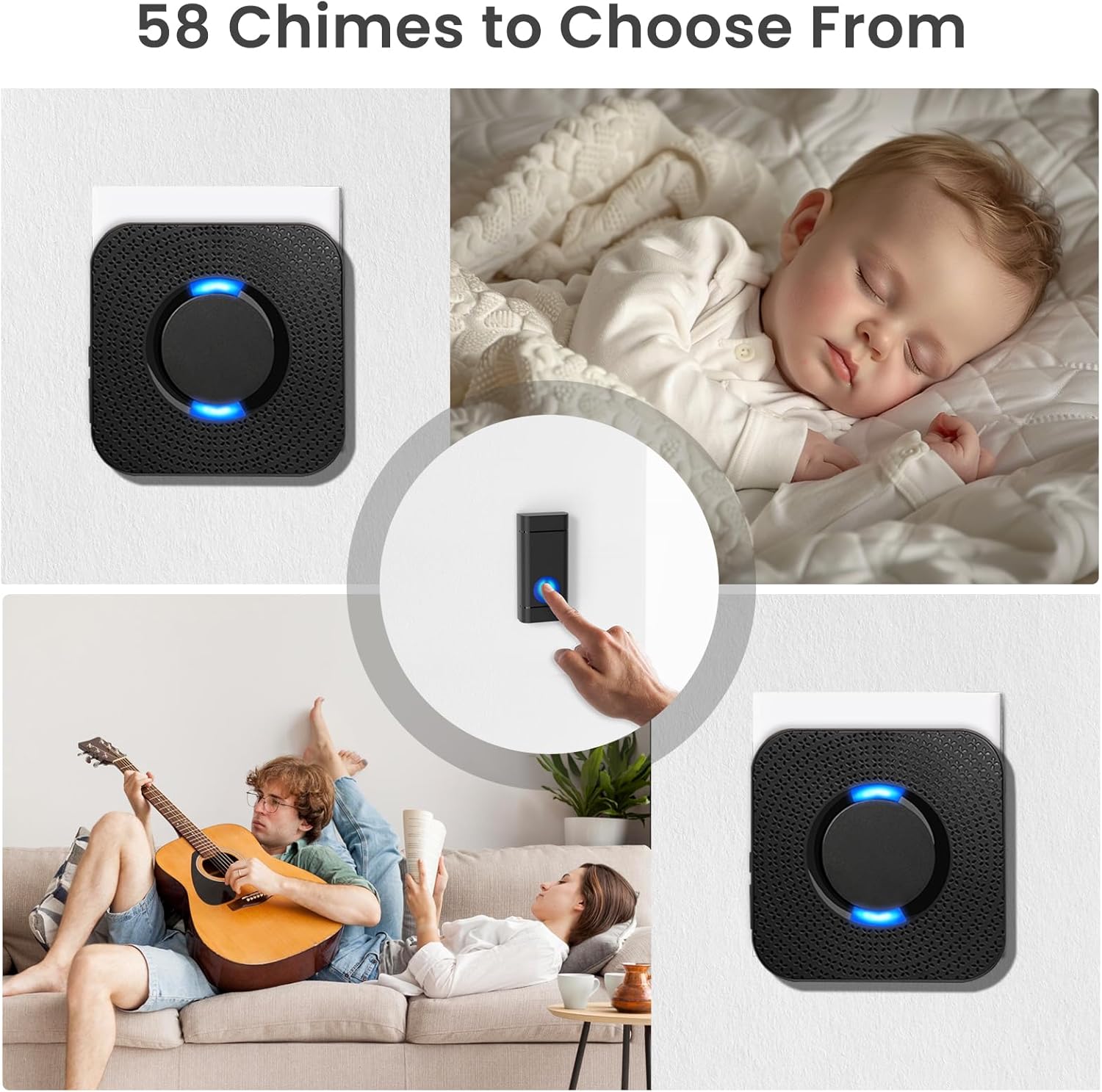 Wireless Doorbell • Waterproof Doorbell Chime Kits • 3 Plug in Receivers & 2 Push Buttons • Long Range 1300ft • 58 Melodies 5 Volume Levels LED Flash • Door Bells & Chimes Wireless for Home/Classroom