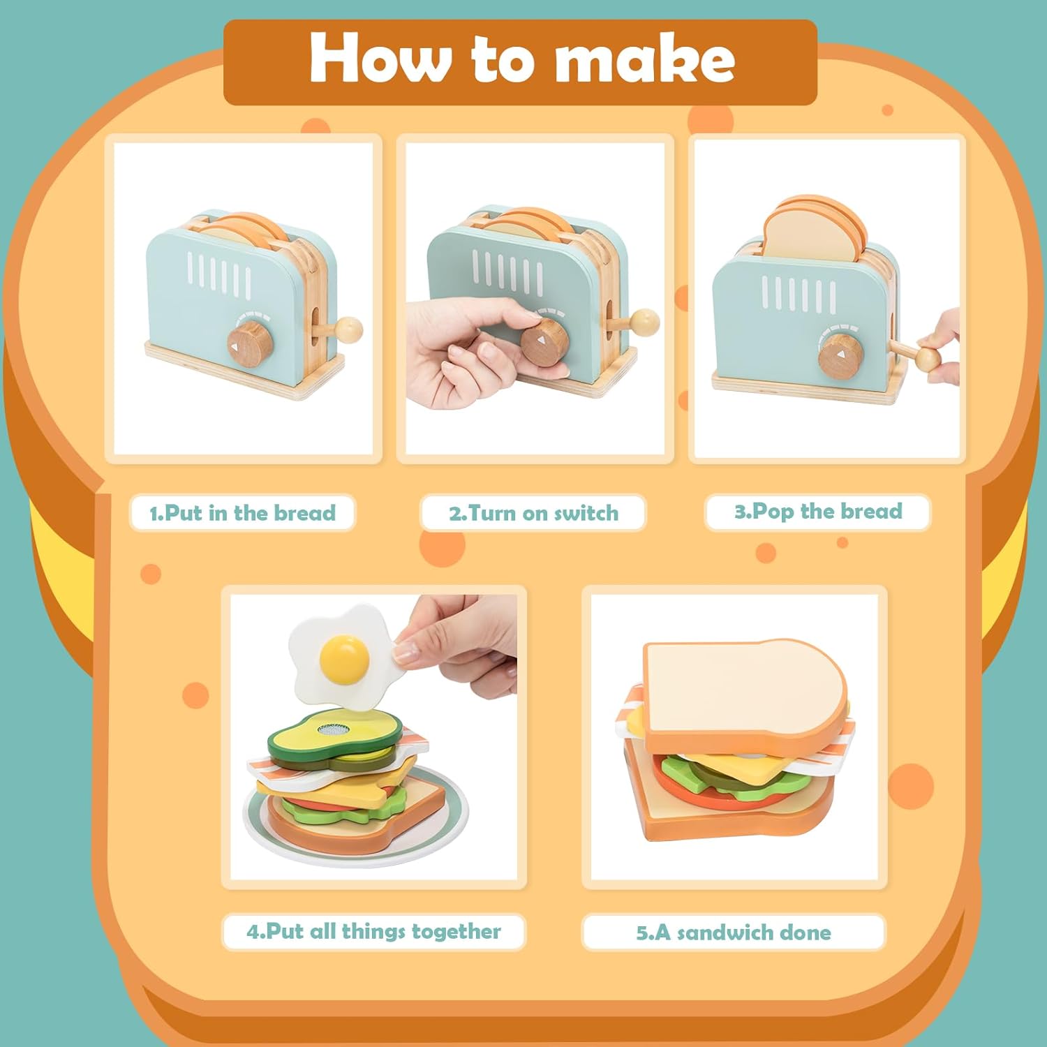 【Safe & Durable Material】:Our Wooden Pop up Toaster&Sandwich Maker is crafted from natural wood with smooth, sanded edges and colored with eco-friendly, non-toxic paint, ensuring its safety for little ones to enjoy endless kitchen party fun.Tested to the highest safety standard. You can buy it for your kids without any worries.