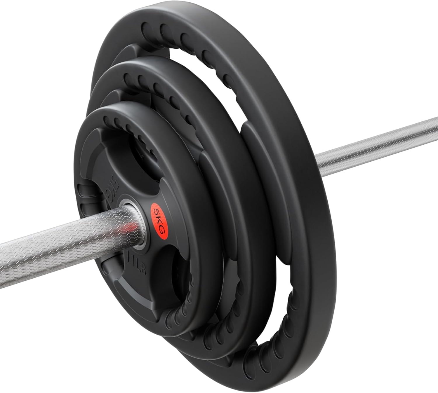Easy to Grip and Load:Each plate features 3 large openings for easy loading and unloading of bar, saving time and effort. The plates are labeled in LB for quick recognition and are great for warm-up exercises