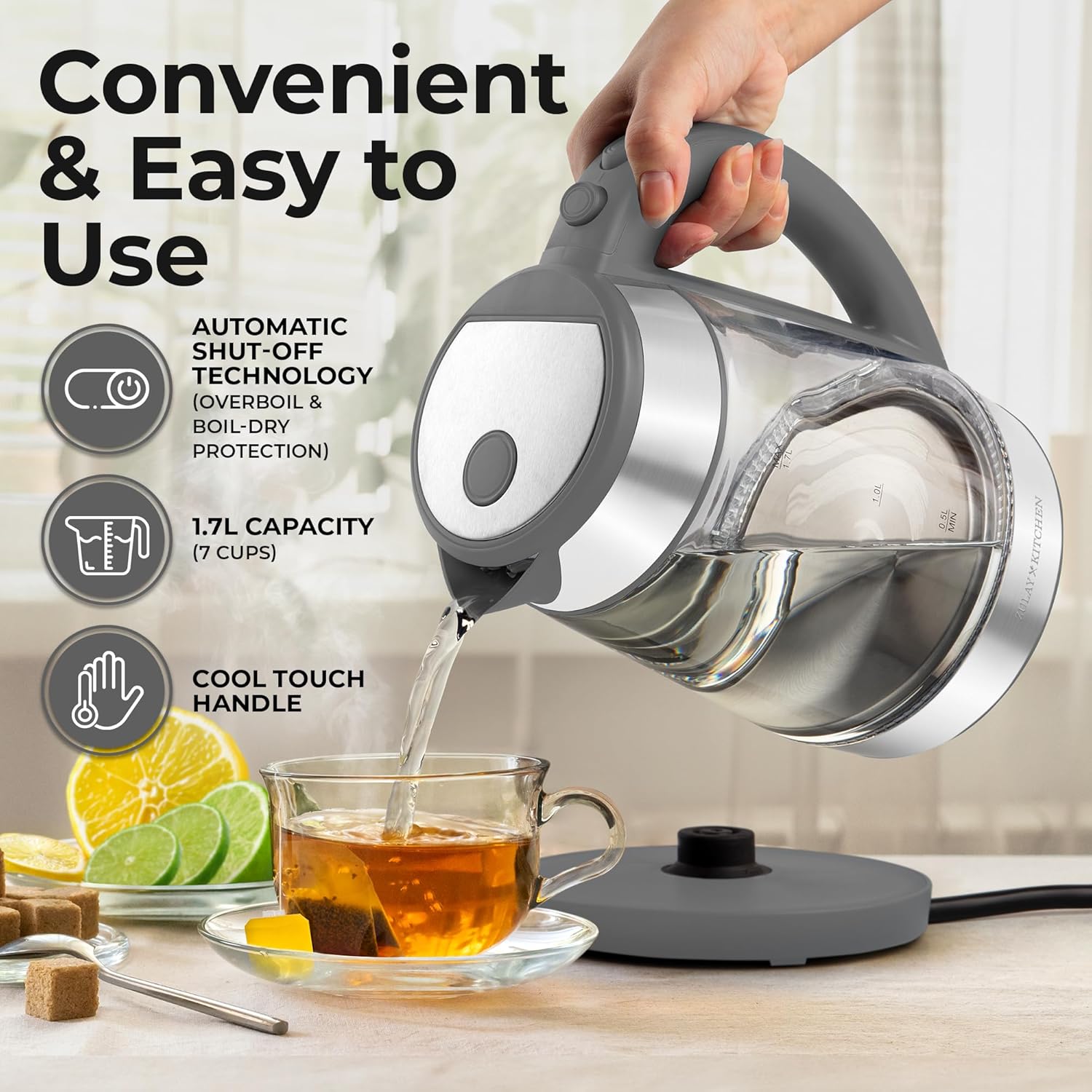 Zulay Kitchen Fast Boiling Electric Water Kettle – 1.7L, 1500W, Auto Shut-Off for Overboil & Boil Dry Protection, Cool-Touch Handle, 360° Base – Rapid Teapot Boiler For Coffee & Tea – Gray