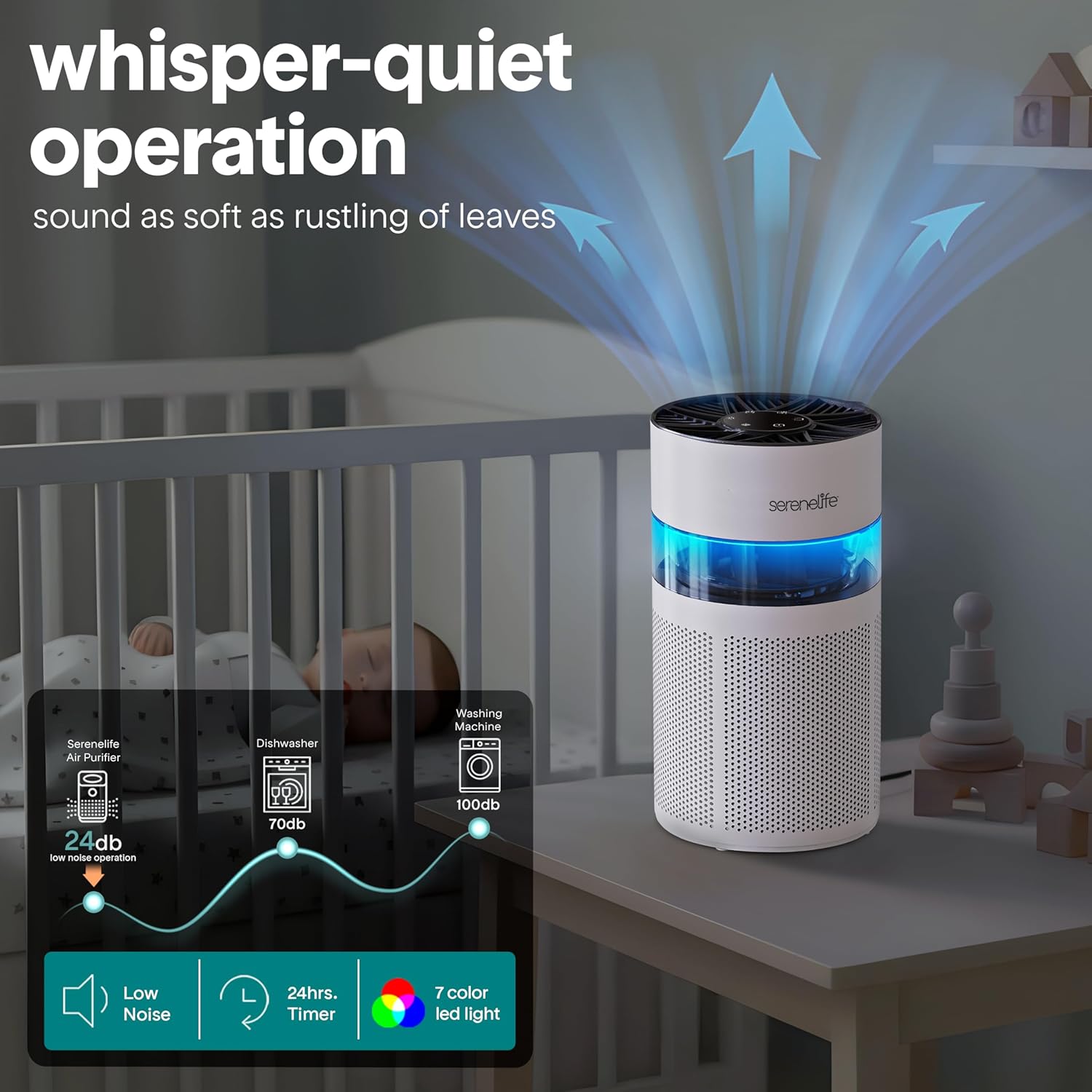 The SereneLife Portable Mini Air Purifier brings powerful purification and soothing ambiance to your space with a sleek, compact design. Engineered for optimum air circulation, this mini air purifier effectively purifies rooms up to 63.8 square feet, making it ideal for bedrooms, desktops, and even cars. With high filtration efficiency, it captures dust and unwanted particles, creating a fresh, comfortable environment while helping to maintain clean, quality air. Equipped with an ultra-quiet operation, it includes an adjustable 2-speed setting, sleep mode, and an energy-saving timer that allows you to set automatic shut-off after 2, 4, or 8 hours—perfect for uninterrupted rest or work. This small air purifier is designed with user convenience in mind, featuring intuitive top-touch button controls, a filter change reminder, and an ambient light that doubles as a digital display for easy monitoring. The detachable base includes an aroma box, so you can infuse your space with your favorite essential oils for a personalized experience. Built with durable ABS construction and a HEPA 13 filter, it’s designed to handle daily purification needs effortlessly, capturing fine particles for long-lasting air quality. Compact and lightweight at just 3.3 pounds, this portable air purifier is easy to move and fits perfectly in any room or on any surface, making it a versatile solution for home, office, and travel.