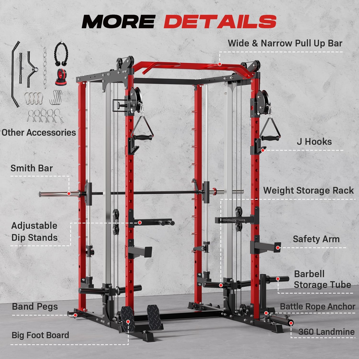 Great Bang For Buck – Roygym multifunctional workout cages includes everything you need: 360°Landmine, Multi-Grip Dip Bar, Pull-Up Bars, T-Bar, Row Bar, Pull-Down Bar, Tricep Rope, Chains, Smith Bar, J-Hooks, Safety Spotter Arms, Exercise Handles, Battle Anchor, Foot Board, Band Pegs, and 2 Barbell clips, 5 Dumbbell Spring Clip, Additional Barbell Storage rack. Customize your workouts, and stay organized.